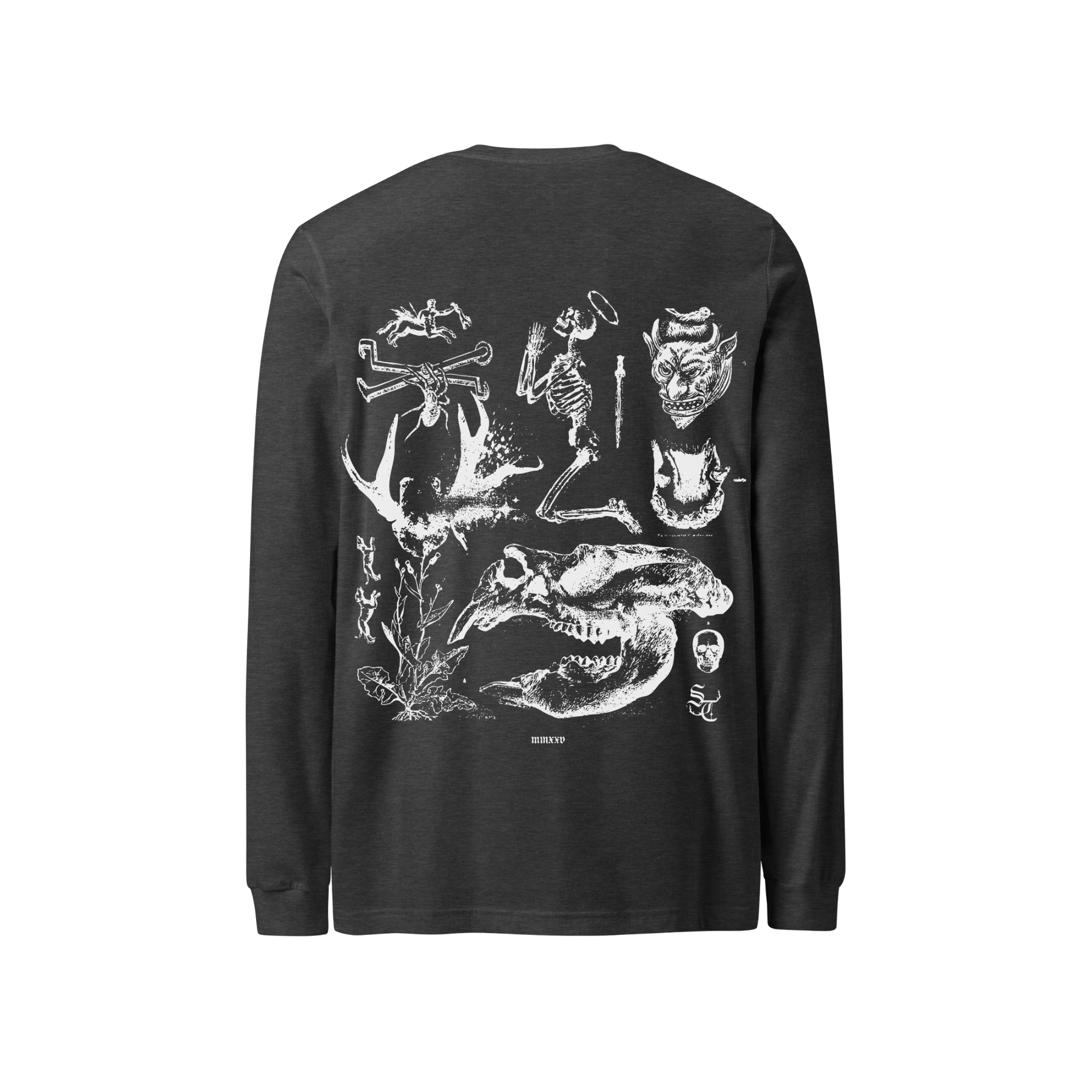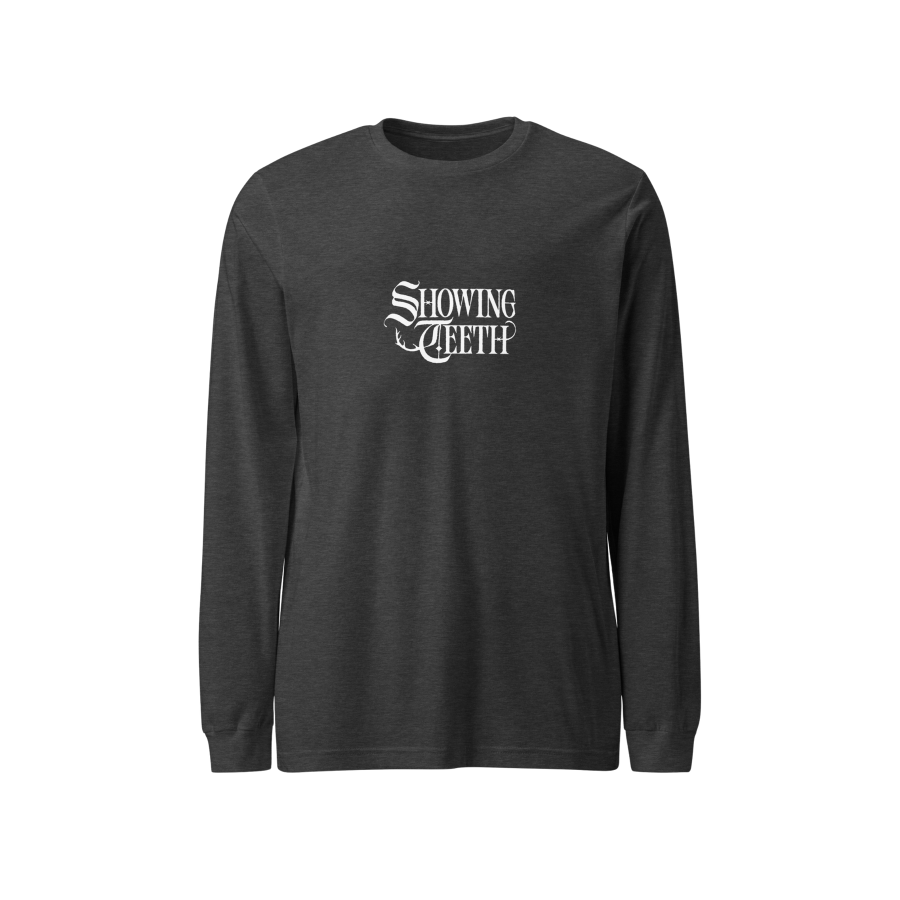 Washed black long-sleeve t-shirt with custom Showing Teeth graphics on front and back.